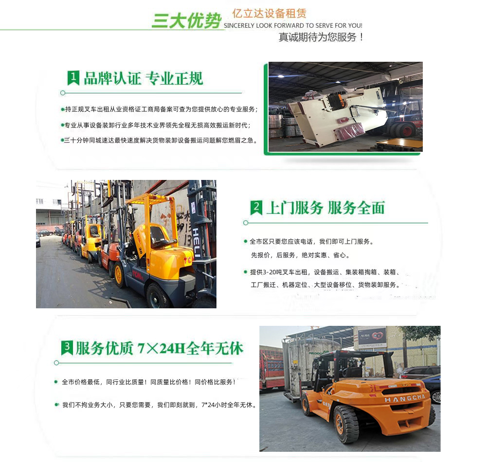 亿立达设备租赁有限公司是工商局准许的天津城市职业学院专业叉车出租公司,公司本着诚信、服务、效率、创新的经营理念,用精湛的技术,真诚的服务,为众多客户提供优质的服务,同时获得信赖与支持。专业提供天津城市职业学院3-20吨叉车出租、叉车租赁、设备搬运、集装箱掏箱装箱、机器移位定位、货物装卸、工厂搬迁、安全可靠,收费透明,价格便宜,随叫随到,24小时上门服务!本公司叉车吊车师傅对各种设备搬运装卸都有深刻探讨和研究。很多的疑难设备搬运,通过我公司的叉车师傅都能迎刃而解。对各种进口设备、国产机器、大型设备搬迁、高难度搬迁、各种精密仪器、医疗设备、科研设备等都能搬运; 提供全市 24 小时上门装卸搬运服务。同时提供厂房搬迁服务。 ...